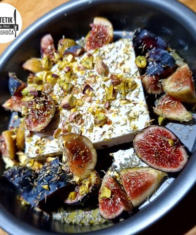 Pripravimo pladenj. Vanj na sredino postavimo 200 g feta sira, okoli potresemo fige in čez vse skupaj še pistacije. Prelijemo z žlico hladno stiskanega olivnega olja, žlico cvetličnega medu in čez vse potresemo dober ščep timijana.