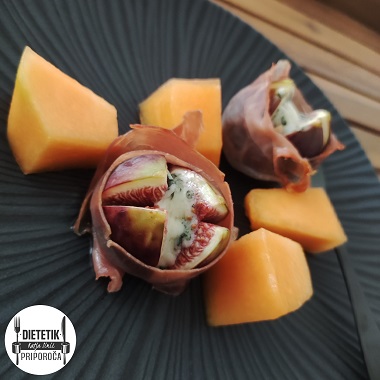 Dve figici (50 g), malce sira (5 g) in rezina pršuta (12 g) z nekaj koščki melone (50 g) prinesejo 200 kilo kalorij, kar je za večino nas ravno odlična malica. A kaj, ko teh 200 kcal v sebi skriva več kot 10 g enostavnih sladkorjev (s čimer se že približamo dnevnemu priporočilu za vnos sladkorjev) in skoraj 1 g soli (s čimer pokrijemo polovico dnevnih potreb po tem mikrohranilu), kar to malico spremeni v sladičko, ki si jo privoščiš občasno. Ob vsem skupaj pa je obrok tudi beljakovinsko reven. Zato: