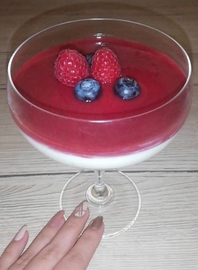 10. Strjeno jogurtovo kremo prelijemo z višnjevim prelivom in postrežemo.