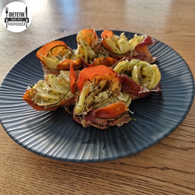 Pripravimo pršut in bučko. Potrebujemo 6 dolgih trakcev pršuta, lahko uporabimo tudi dva krajša, ki ju na površino položimo enega za drugim, da dobimo dolg trak. Izberemo dolgo "zuccini" bučko, ki jo tanko narežemo na 12 trakcov. Za vegi verzijo pršut izpustimo, a v tem primeru bučke malenkost posolimo. Namesto pršuta lahko uporabimo tudi slanino.