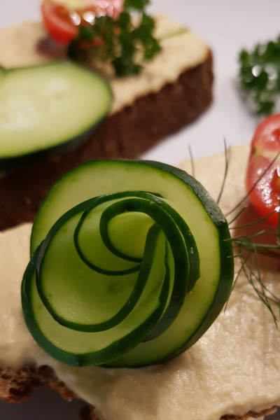 Da v tem "receptu" poudarek ostane na garniranju, sem za namaz tokrat uporabil humus, lahko pa bi si dal duška tudi s skutinim namazom. Za pestrost sem izbral polnozrnat kruh z mešanimi semeni. Ker je mesec kumare, seveda ni šlo brez nje, za kontrastno barvo sem izbral češnjev paradižnik, začimbi pa sta vizualno zanimiva in okusa polna koper(c) in kodrolistni peteršilj.