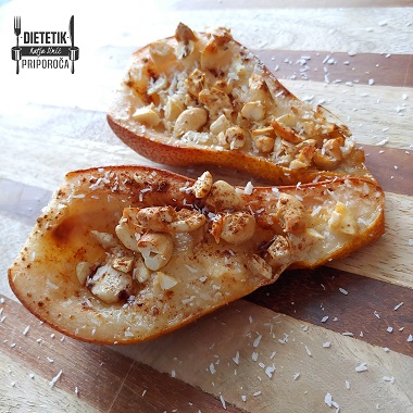 Hruško operemo in po dolgem prerežemo na polovico. Izdolbemo z žličko.
