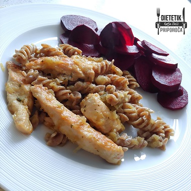 Segrejemo olivno olje in na njem prepražimo piščančje meso iz obeh strani (izberemo lahko katerikoli del piščanca). Ko rahlo porumeno ga vzamemo iz ponve in shranimo na krožniku.