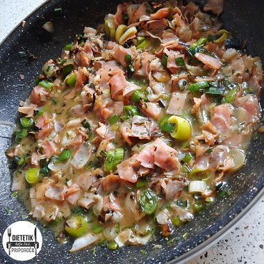 Na olivnem olju popečemo čebulo in dodamo por narezan na tanke kolobarčke.
