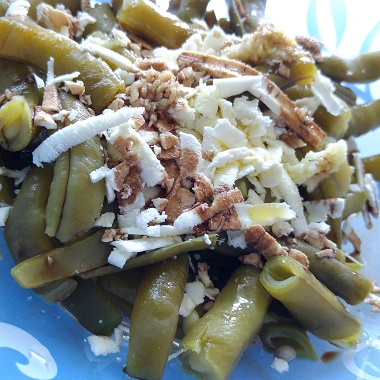 Fižol pretresemo v skledo za solato, ga posolimo, popopramo in dodamo po okusu česen ali čebulo (ali oboje).