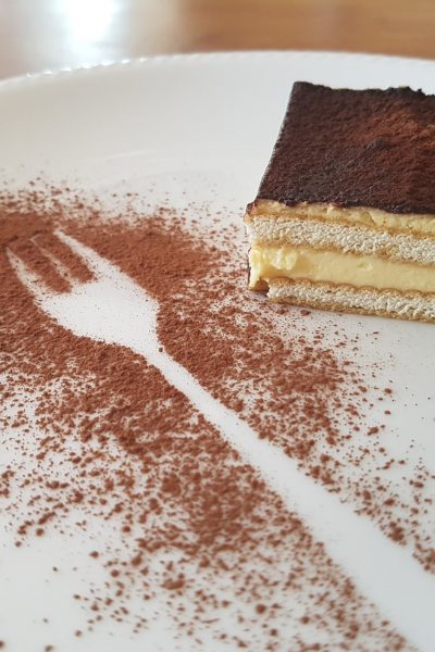 4. Na prvi sloj namažemo polovico kreme, jo čimbolj poravnamo in namočimo in zložimo drugi sloj piškotov. Namažemo s preostankom kreme in poravnamo ter debelo posujemo s kakavom v prahu.